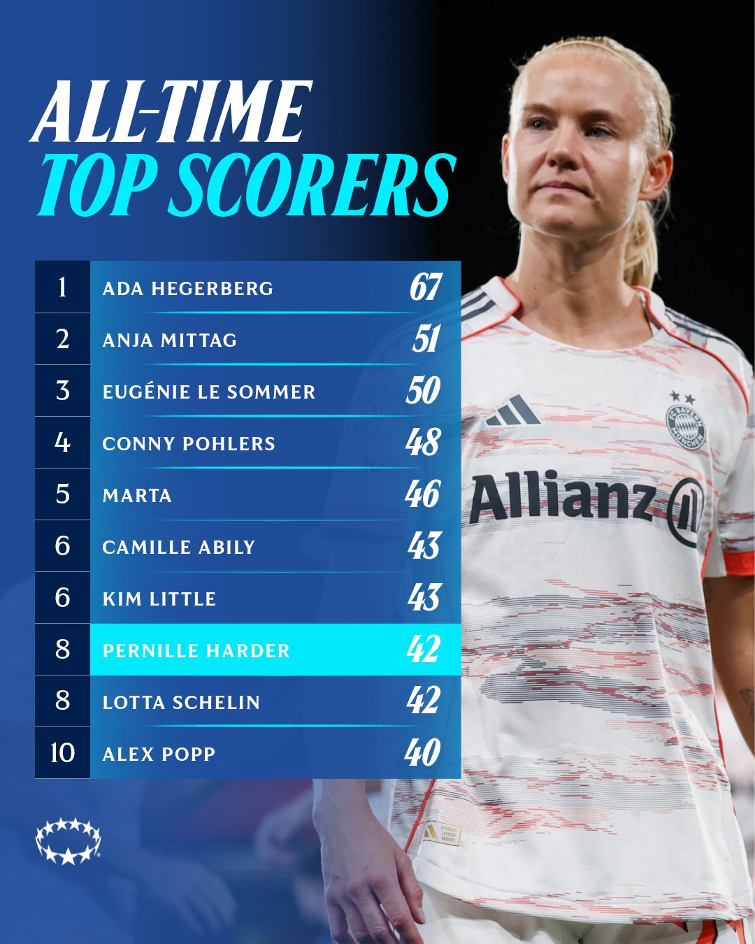 Pernille Harder draws level with Lotta Schelin in the all-time UWCL top scorers list